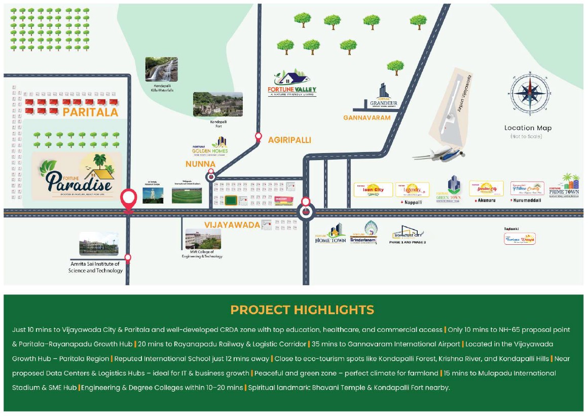 Harivillu’s Fortune Paradise We are proud to present Project 18, the 12-acre premium gated community, located in the scenic village of Paritala, Kanchincharla, right on the Vijayawada-Hyderabad Highway. This highway-facing project offers open plots starting from 183 square yards, thoughtfully designed for those who dream of a peaceful life surrounded by nature. Whether you’re looking for a serene weekend retreat or planning your dream home, this is the perfect destination.