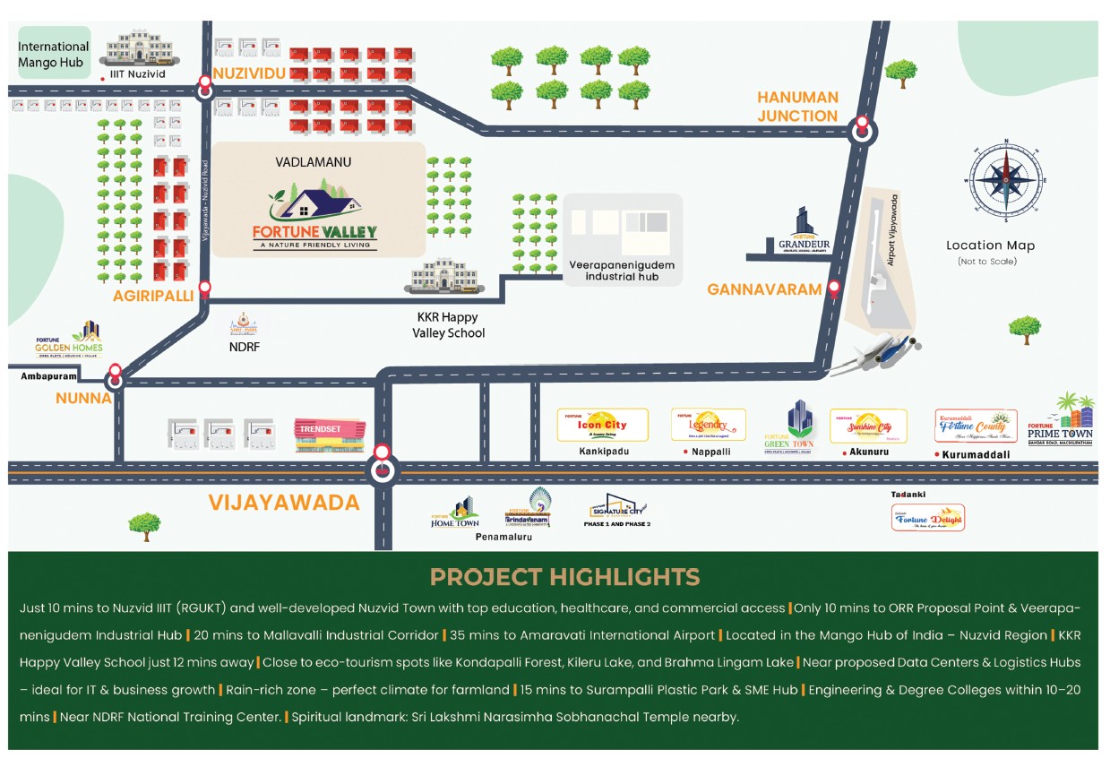 Harivillu’s Fortune Valley We are proud to present Project 17, the first-ever 25-acre farmhouse-themed gated community, located in the scenic village of Vadlamanu, Agiripalli, right on the Vijayawada-Nuzvid Road. This premium project offers open plots starting from 186 square yards, thoughtfully designed for those who dream of a peaceful life surrounded by nature. Whether you’re looking for a serene weekend retreat or planning your dream farmhouse, this is the perfect destination.